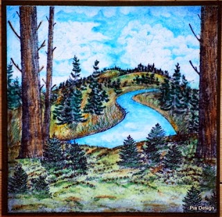 The tree stamp, from Personal Impressions, Winter Birds-Tall Trees, just asked to be made into a card for the November challenge, so I just had to buy it. I paired it up with two of Clarity Reindeer stamps, which I stamped onto the card first. I covered the deer with masks and then stamped the trees three times. After colouring the deer using Promarkers I used Adirondack inks and torn paper with a sponge to create the sky and the snowy foreground and then added a little sparkle to the trees using a Clear Star Gelly Roll pen, before layering onto a piece of card which I had embossed around the edges using Versamark and Heat it Up embossing powder in blue.