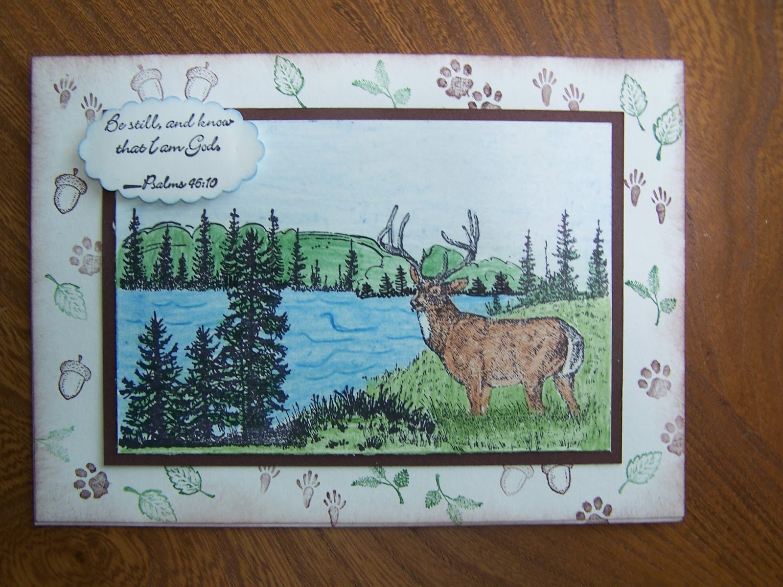 Two more entries! My friend Maureen's deer is obviously not proudly standing in the Texas woods! Although maybe the Piney Woods of East TX??? No, we decided it must have been seen on a trip to cooler parts of the country! She used stamps from Stampin' Up, and Prisma Color pencils.